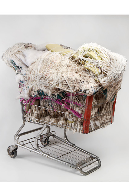 Morris has chosen not to organize the exhibit chronologically. Instead, viewers can sample works from throughout Scott’s career displayed across two rooms. Smaller, early pieces, which experiment with paint and glue as well the as binding that would become her signature, are placed in proximity to such powerful works as a shopping cart hobbled by missing front wheels, its contents encased in layers of yarn and string. Seeing them together, I’m struck by the range of objects Scott incorporated into her work: spindles, tubing, wires, plastic and cardboard cones, packing material, funnels, a chair, a