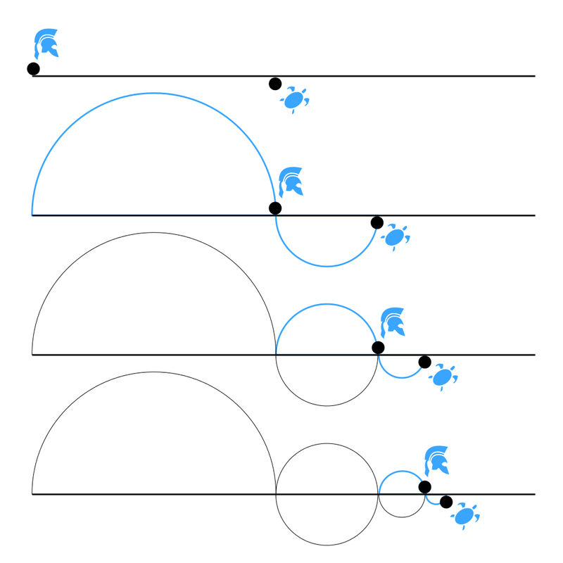 Parmenides’s lover was (reputedly) Zeno of Elea, another philosopher. You might recognize his name because Zeno’s paradoxes are one of the few pieces of Greek philosophy that persist in popular culture today. People remember the gist of it: a space—a football field, an arrow and target—and talk about moving from one end to the other in steps, each time dividing in half the remaining distance. You can move half of the way there, they say, and then half that, and so on and so forth. Yet because you can halve the distance an infinite number of times, it takes an infinite amount of time to reach the target. We should never get there.
