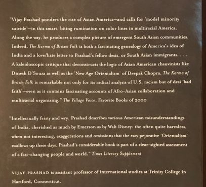 But I had only skimmed Du Bois, and so it wasn’t until a few years later that I heard my people called “brown,” our condition “brownness.” When Lisa said the title of her partner’s book–The Karma of Brown Folk–I felt, as the kids now say (but did not say in the Fall of 1998), seen. The book riffs off of Du Bois’s question, Lisa told me, “How does it feel to be a problem?” and asks South Asian Americans “How does it feel to be a solution?” Which is to say: How does it feel to be white America’s way of saying, “See these brown people made it, why can’t you Blacks?” Which is, then, also to say: How does it feel to be a model minority, adjacent to white and aspiring always, in your actions if not in your intentions, to whiteness? Which is to say, finally: How does it feel to be a knee on the necks of Black Americans?