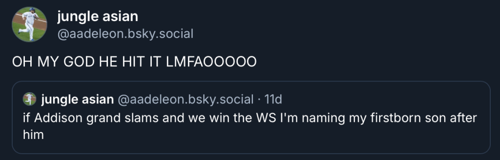Despite the conciliatory tone of his final message, I knew Freddie’s walk-off homer in the bottom of the 18th, with shades of G1 in 2024, must’ve eviscerated Adrian as much as it elated me. It was time to shut up and go to bed.