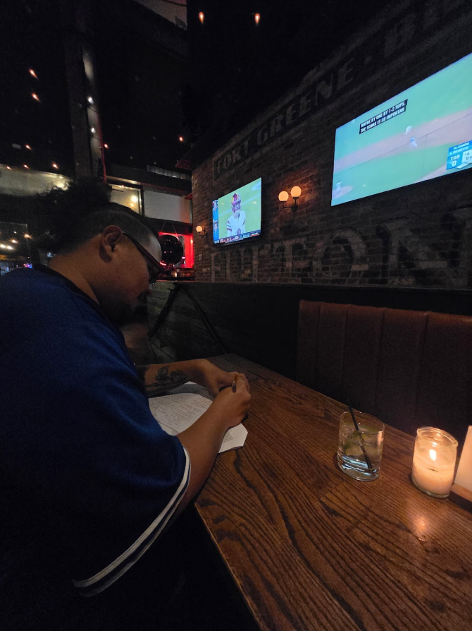 I watched the game at the lobby bar of an indie theater in Williamsburg, where my partner was running the Brooklyn Horror Film Festival. With much foresight, she asked the theater to project the game onto the wall above the staircase, and I booked it to Union Square to catch the ironically-named L train, which I had hoped was not premonitory for anything. The theater ebbed and flowed with Brooklyn arts types and queer goths, often both at once, and at the bar, it became clear that I was the outlier sports fan when I was yelling at the wall with a Fernet in hand, long after everyone else had shoved their way into the auditorium.