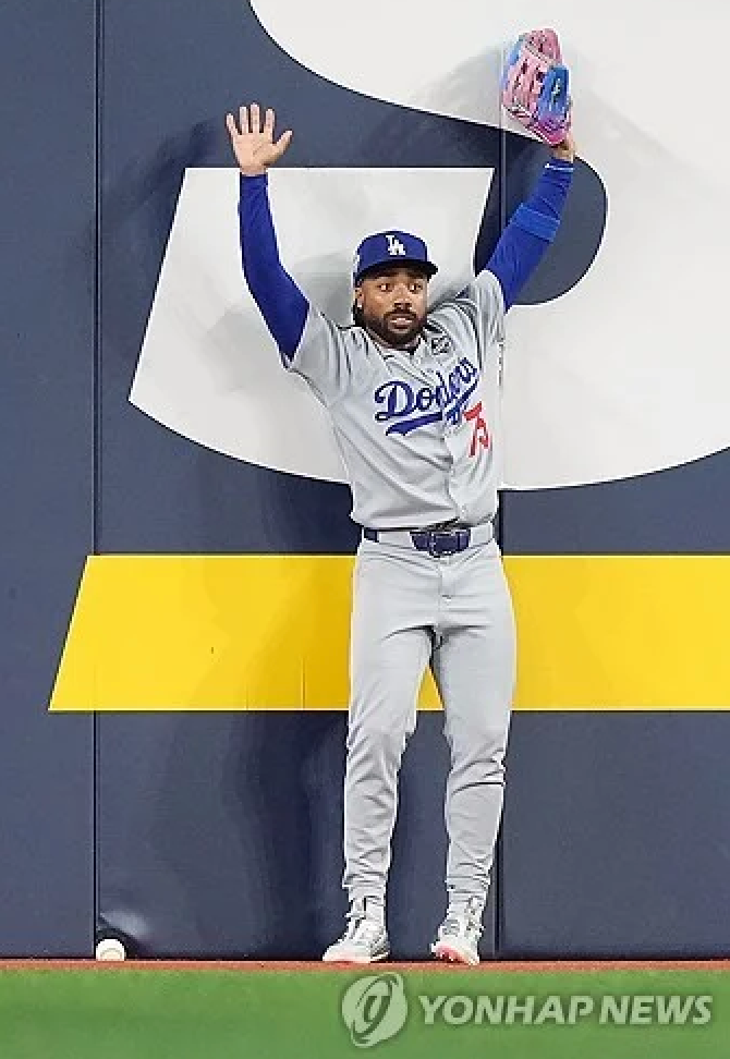 Addison Barger, the same guy who staked Dodger hearts with a pinch hit grand slam in G1 came to the plate and hit a towering fly into center field over Justin Dean’s head. That hit, likely a double or even a triple, would’ve tied the game with no outs, putting Barger in scoring position to win it all for the Jays. As if commanded by the (Dodger) baseball gods, the ball simply dropped dead into the padding of the Rogers Centre outfield. Dean flung his hands up into the air to signal the umps for a dead ball.