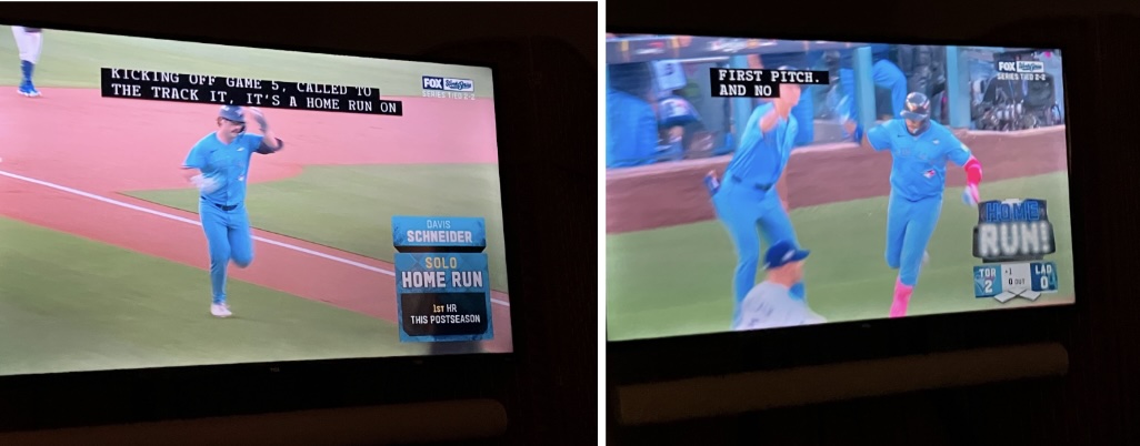 I threw my now unlucky clothes and totems into a dirty laundry bag in my suitcase, and surrendered to the conference, knowing full well that I had another group dinner scheduled while G2 was scheduled to air. I was much more cautious and undertook a regime of rest and rehydration to prepare. Yoshinobu Yamamoto was on the mound that night, and he’d just thrown a complete 9 innings in his last start for the NLCS. Derek Jeter emphatically stated on the pregame show that Yoshi wouldn’t be able to do it again. Since everyone knew–and witnessed in G1–how the Dodgers’ bullpen was absolute ASS (and had been for most of the season), Yoshi’s unlikely capacity to “do 9 innings again” spelled more trouble for Los Doyers in Toronto.