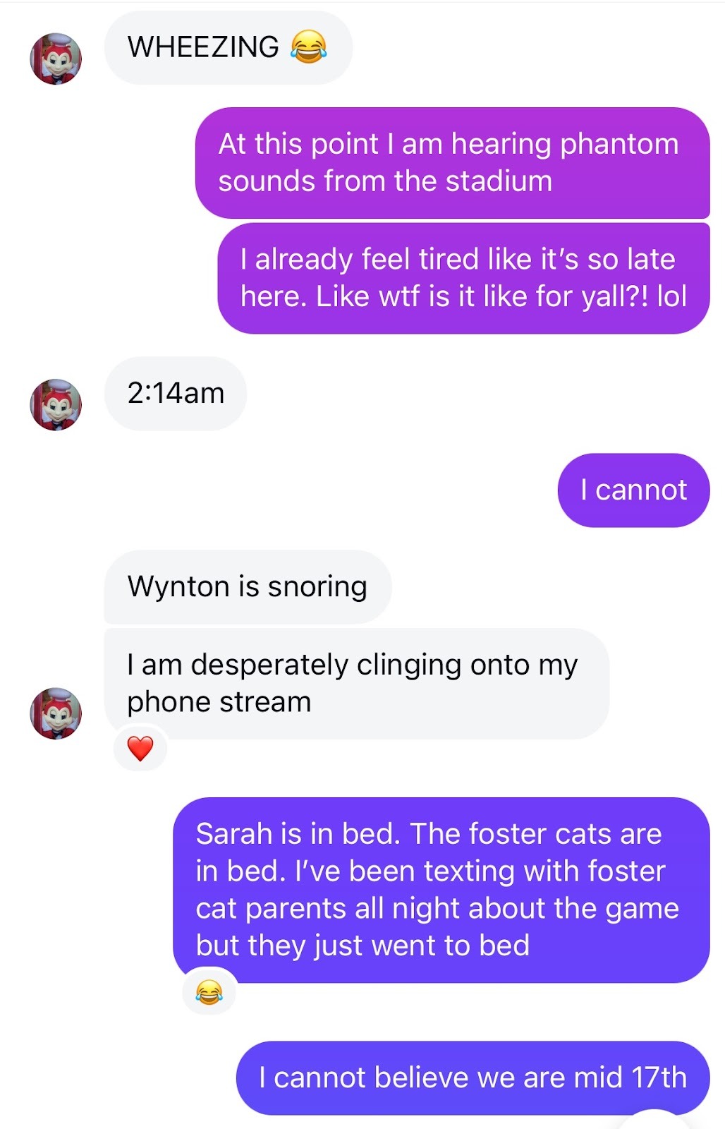 The Blue Jays’ catcher, Alejandro Kirk clocked Tyler Glasnow with a three run homer in the top of the 4th, flipping the game upside down as the sports announcers like to say. It was then that Chelsea, a diehard Latina Dodgers fan, and I fully converted our group chat for Speedy and Amelia into a Dodgers anxiety thread. I changed my clothes back into my recently laundered lucky Dodgers shirt (featuring the 2024 World Series championship trophy), and stuck to my neurotic routine of not watching our pitching halves each inning. I also convinced myself that vigorous texting with the cat thread and other friends like Oliver Wang should be added to my many superstitious rituals.