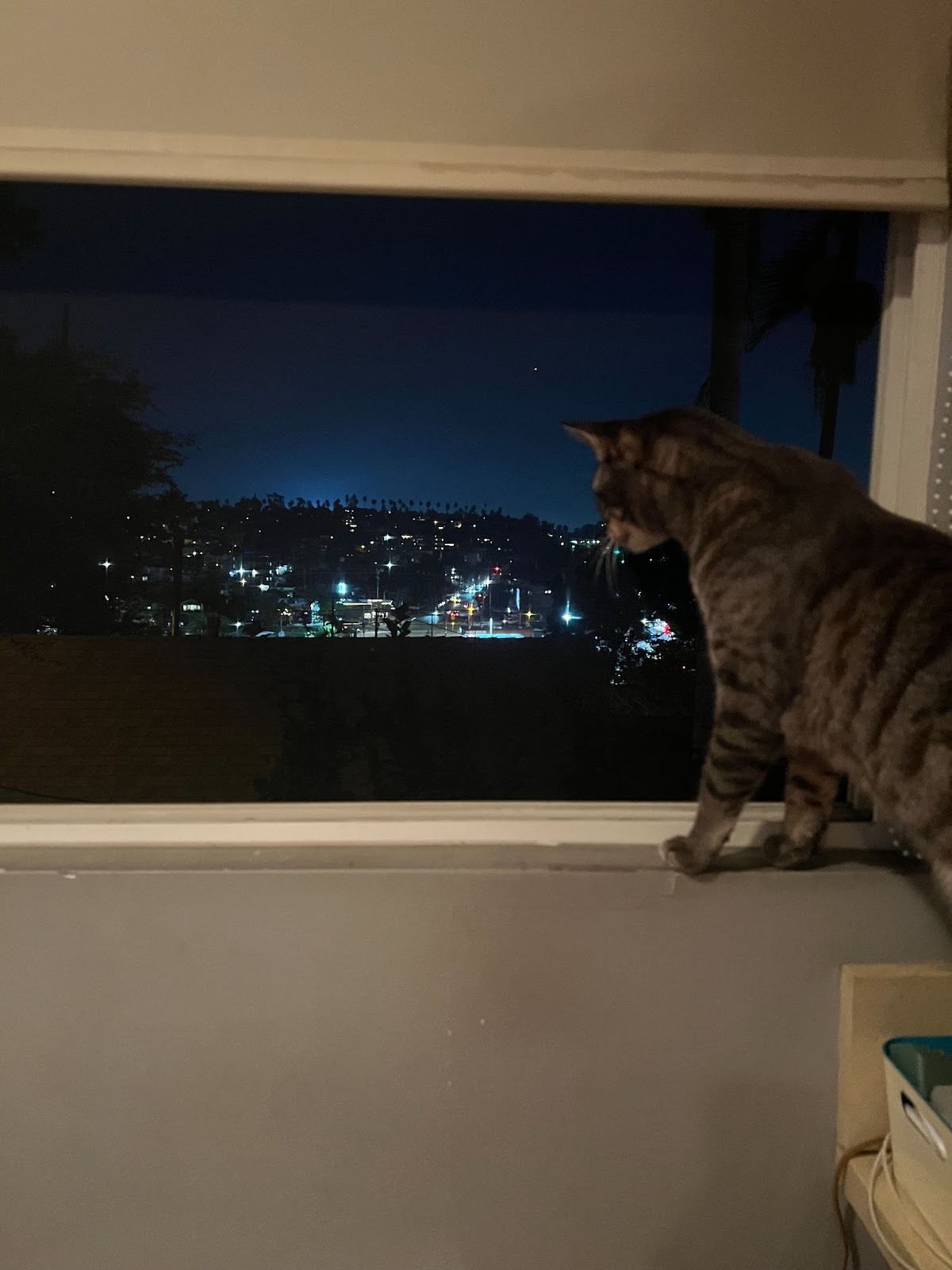 That evening, our foster cats’ “real parents,” Chelsea and Nick Berkofsky began texting us about the game. We ended up with their litter-mate tabbies, Speedy and Amelia, after the Altadena fires consumed their home in early January. The family had to downsize into a studio apartment in Echo Park with their other cat, their dog and their toddler. As bereaved cat parents who lost both of our beautiful littermates Lily and Corky within a calendar year, we offered to help the Berkofskys out with a long-term foster situation for at least two of their brood.