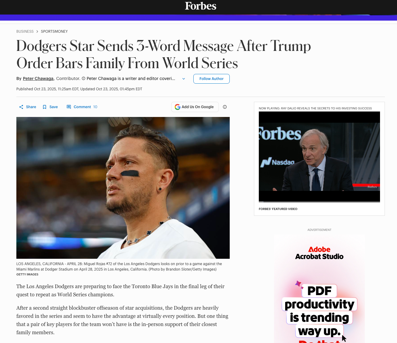 Miguel Rojas is also a Venezuelan player whose family members weren’t granted visas to watch him play, because of the United States’ fucked up immigration policies and travel restrictions.