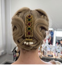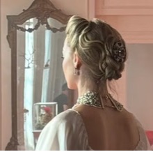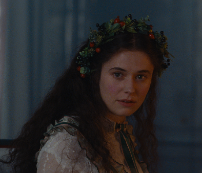 As a child, Catherine’s hair flows in unrestrained, naturalistic waves, whipped by the wind on the moors. As she ages, becoming less impulsive and more strategic, we notice a corresponding metamorphosis in her hairstyle. Her hair will remain relatively unbound when she is pursuing her own desires—masturbating on the moors, for instance, or making out with Heathcliff. In these scenes, her hair may not be completely free, but it is usually only partially braided or casually twisted into a loose half-pony. However, when Catherine turns her attention towards engineering her marriage to wealthy neighbor Edgar Linton, we can tell right away that the attraction is pragmatic, rather than erotic, from the tied and twisted hairstyles she wears at his estate.