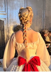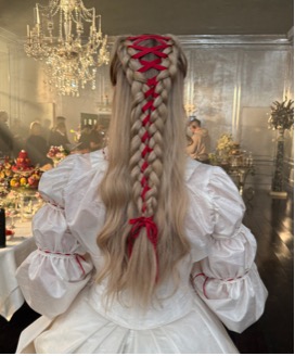 This hairstyling, I am convinced, is where all the sexual tension is displaced. In what is already becoming an iconic look from the film, Catherine’s hair is fashioned into a “corset braid”: two Dutch braids starting near her temples, then laced together down the back through narrowing criss-crosses of ribbon. (Tutorials to replicate this style are already a-dime-a-dozen on TikTok and YouTube.) Appearing so closely following the scene in which Catherine repeatedly insists that Nelly lace her “tighter! Tighter!” into the corset she wears to her wedding, it’s hard not to see the parallel between the two styles. Directly prior to her wedding night, we see the criss-crossing laces across her back; directly after, we see analogous lacing pulling together her plaits. The tension lies not only in the laces themselves, but in the sexual release that Catherine very clearly isn’t achieving with new husband. (We don’t actually see the wedding night sex, it’s true. But Catherine’s dissatisfaction with her new partner comes across quite clearly in a later scene, when she obviously fantasizes about Heathcliff during very boring missionary sex with Edgar.) In this new life, Catherine will trade the frank expression of her adolescence for an existence that’s physically more restrained, but visually far more opulent.