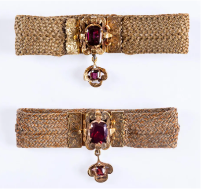 In Brontë’s novel, Catherine is buried with snippets of both Edgar’s and Heathcliff’s hair tucked away inside her locket (a locket which Margot Robbie subtly evokes in the oversized heart necklace she wore for one of the film’s premieres). But more commonly, it was not the dead adorned with the locks of the living, but rather the living who touted the tresses of the dead. Emily Brontë herself had a bracelet woven of her two sisters’ hair—a replica of which Margot Robbie wore to one of the film’s premieres.