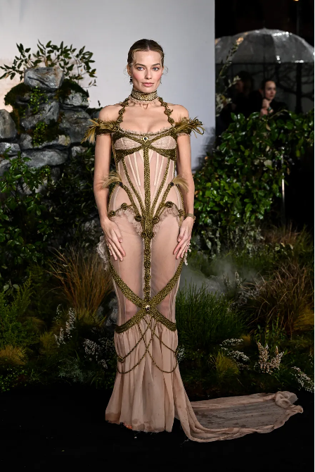 This bracelet complemented a barely-there gown with such self-effacing fabric that the garment seemed to be made almost entirely of its distinctive gold trim. A closer look reveals this trim is made entirely of real human hair, selected to match the colors in Brontë’s bracelet, then expertly plaited, feathered, and knotted in the style of Victorian mourning jewelry. The fact that the color of this hair almost exactly matches Robbie’s own adds a nice frisson of creepiness. Like the doll in the film, whose real hair transgresses the boundaries between living and non-living, person and plaything, Robbie’s ingeniously styled premiere look weaves her into the material archive of the author whose work she embodies.